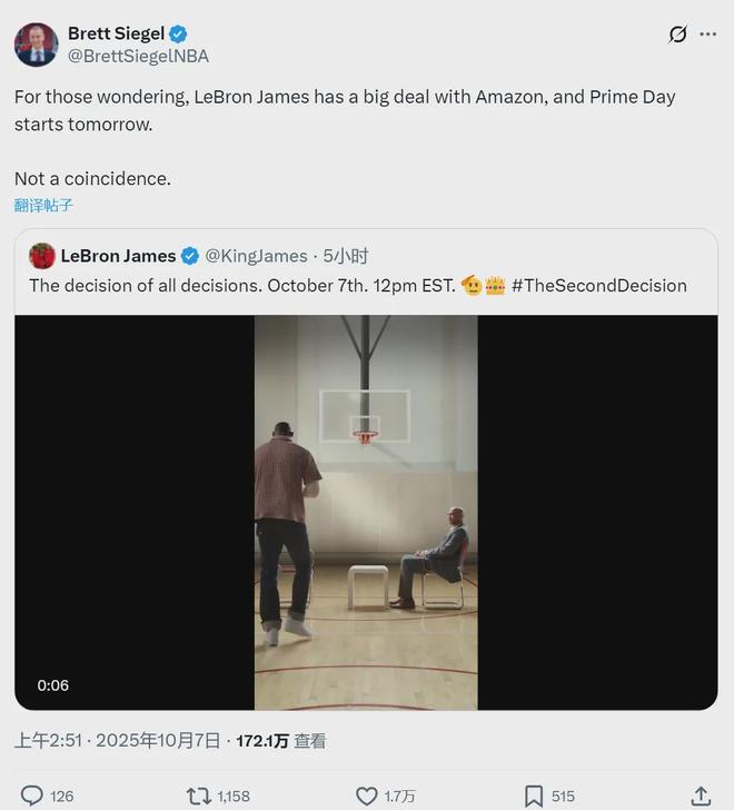 不过Clutch Points的记者Brett Siegel给了另一种说法:“詹姆斯跟亚马逊签了一份大合同,Prime会员日则在明天开始,这绝非偶然。”