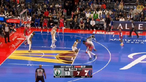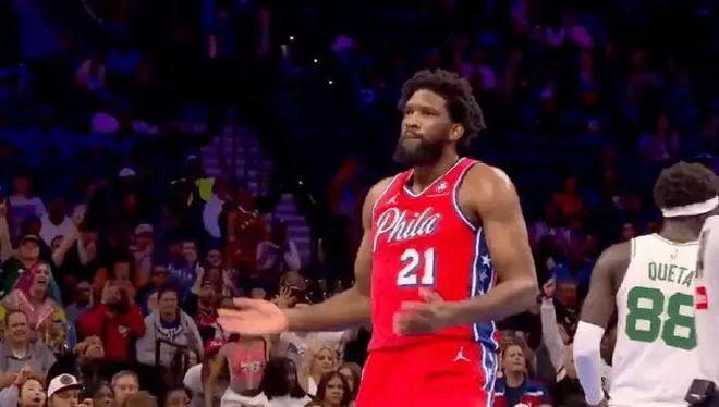打凯尔特人,恩比德命中了一个平平无奇中距离且造成了对手犯规