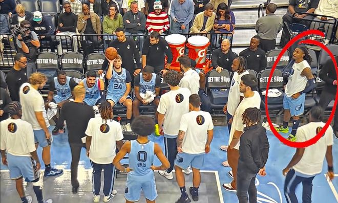 暂停期间,教练画战术板时间,莫兰特都故意离得远远的,把自己当成了局外人。